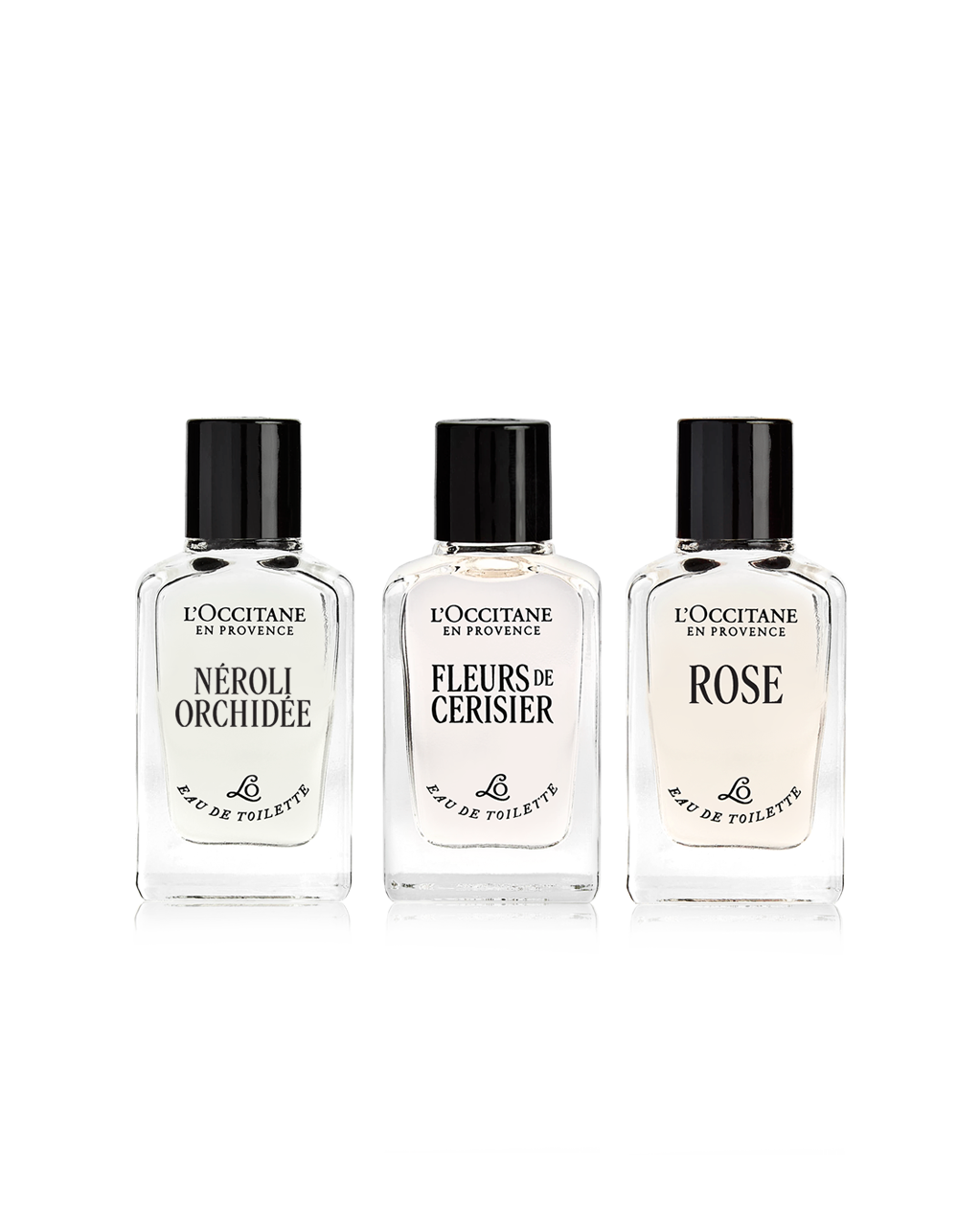 Fleurs de Cerisier Eau de Toilette (7.5ml; 0.25 fl. oz.): Both delicate & floral, evoking fresh notes of cherry blossom from Provence, lily of the valley, and a base of creamy amber and woody musk.