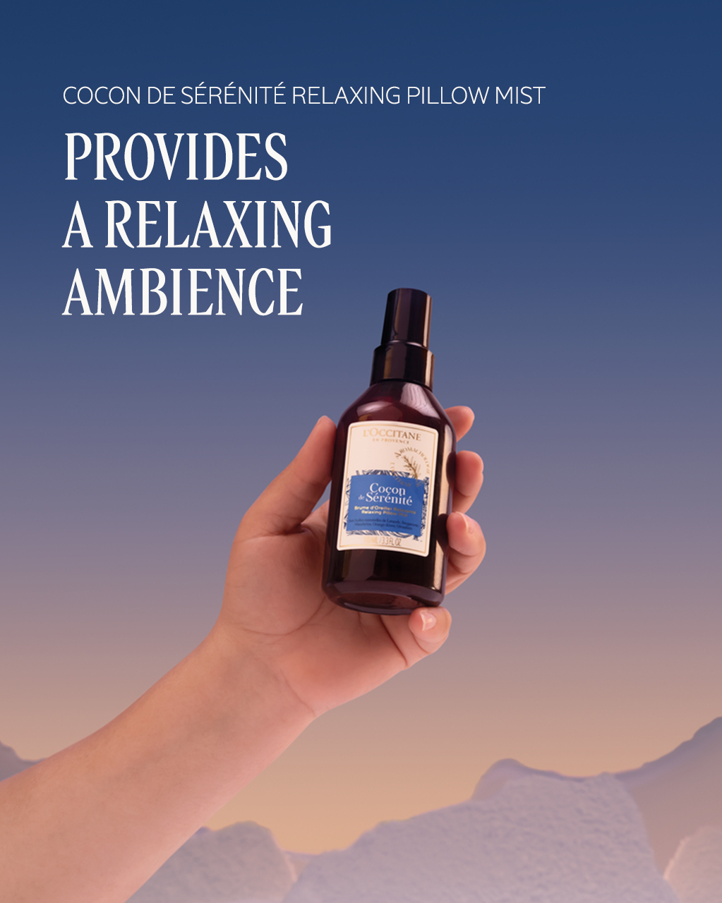 Cocon De Sérénité Relaxing Pillow Mist (3.3 fl. oz.; 100ML): With a blend of essential oils, this aroma creates a calming atmosphere that helps promote a sense of relaxation.