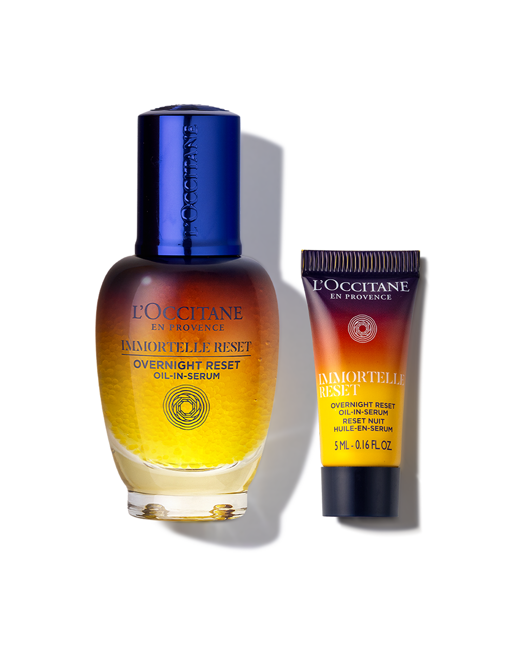 Set comes preassembled in gift box and includes: Immortelle Overnight Reset Oil-in-Serum 1 fl. oz.; 30ML and 0.16 fl. oz.; 5ML